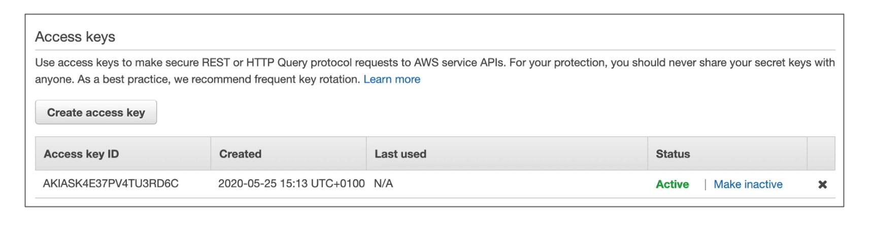 - "액세스 키 ID" 열에서 해당 IAM 사용자의 액세스 키 ID를 찾기
