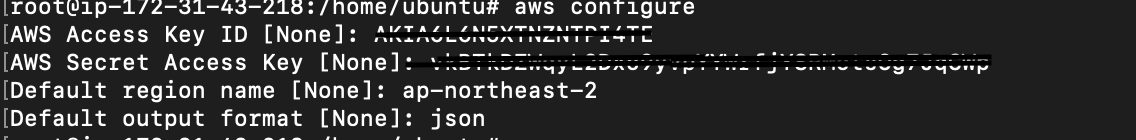 - AWS 계정에 액세스하기 위해 AWS CLI를 구성해야 한다 . aws configure 명령을 실행하면 아래와 같은 옵션들을 수정할 수 있는 라인이 뜬다.