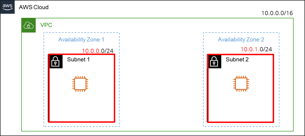 예를 들어, VPC의 CIDR 블록이 10.0.0.0/16이고 가용 영역이 두 개라면,