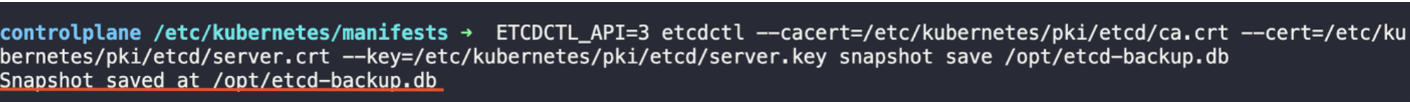 ETCDCTL_API=3 etcdctl --cacert=/etc/kubernetes/pki/etcd/ca.crt --cert=/etc/kubernetes/pki/etcd/server.crt --key=/etc/kubernetes/pki/etcd/server.key snapshot save /opt/etcd-backup.db