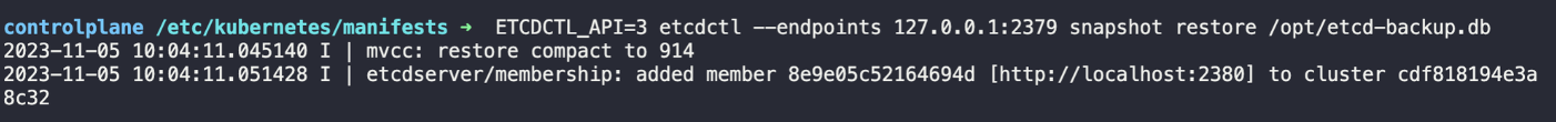 ETCDCTL_API=3 etcdctl --endpoints 127.0.0.1:2379 snapshot restore /opt/etcd-backup.db