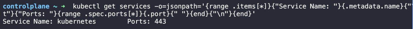 controlplane ~ ➜ kubectl get services -o=jsonpath='{range .items[*]}{"Service Name: "}{.metadata.name}{"\\t"}{"Ports: "}{range .spec.ports[*]}{.port}{" "}{end}{"\\n"}{end}'