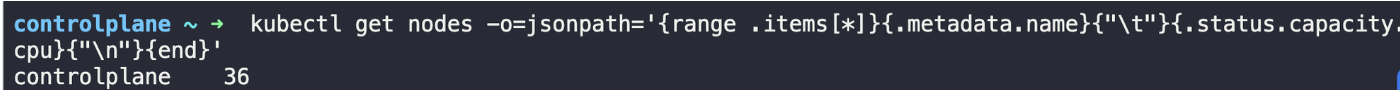 controlplane ~ ➜ kubectl get nodes -o=jsonpath='{range .items[*]}{.metadata.name}{"\\t"}{.status.capacity.cpu}{"\\n"}{end}'