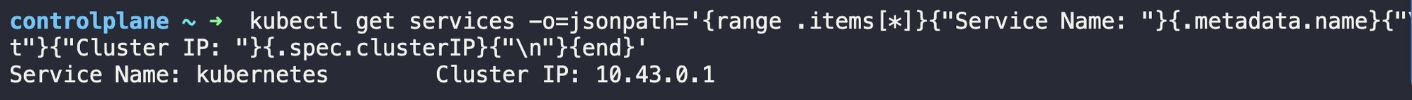 controlplane ~ ➜ kubectl get services -o=jsonpath='{range .items[*]}{"Service Name: "}{.metadata.name}{"\\t"}{"Cluster IP: "}{.spec.clusterIP}{"\\n"}{end}'