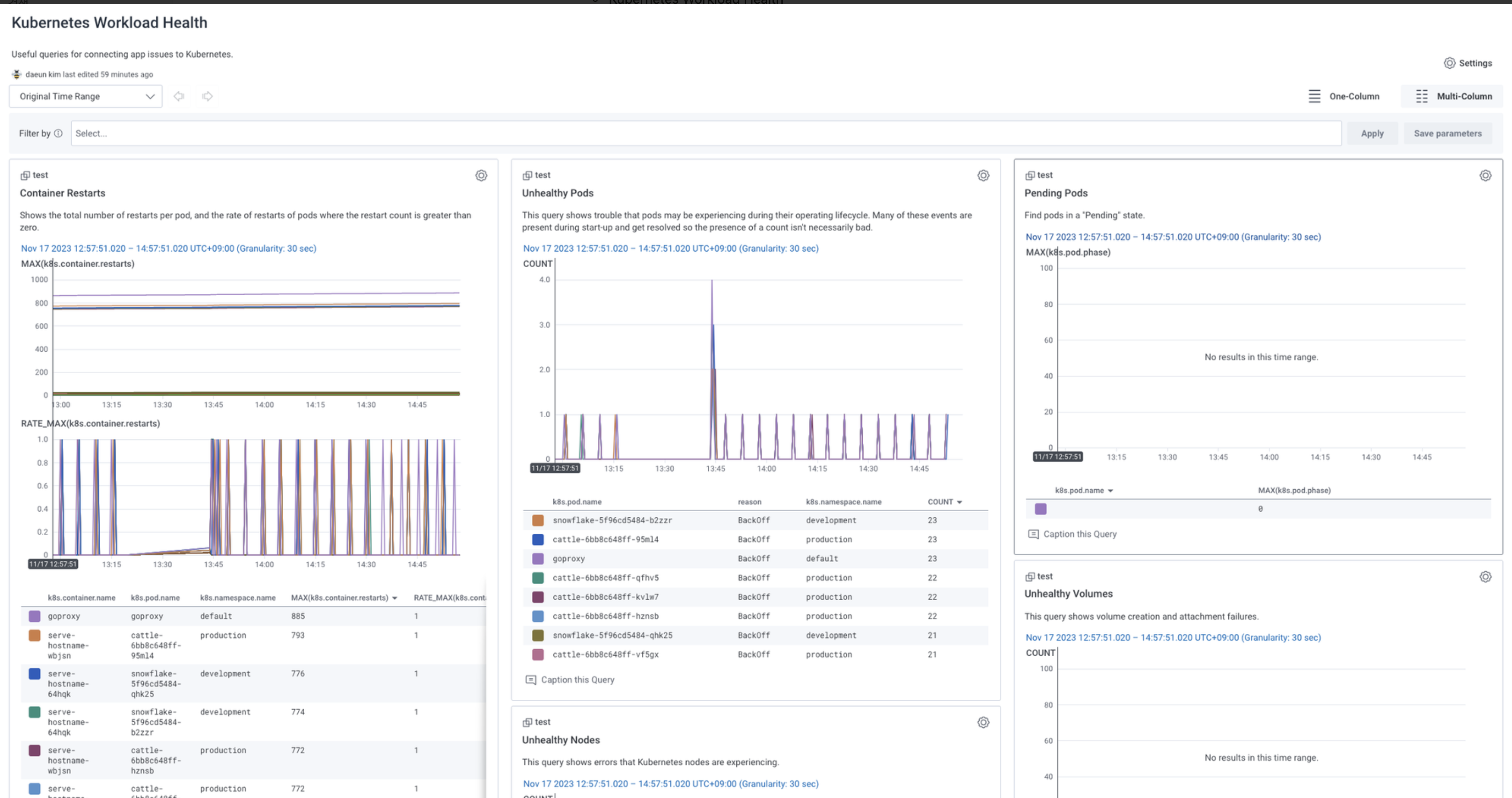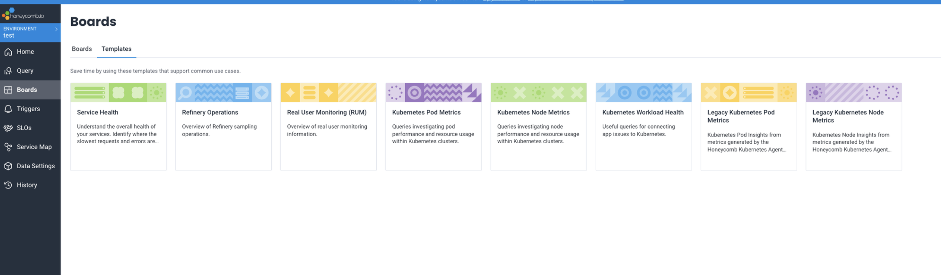 - 몇 분 후에 데이터가 Honeycomb으로 유입되기 시작합니다. 하지만 가장 기본적인 이벤트 기록만 보여주기 때문에 사용자가 직접 Query를 사용하거나, 기본 템플릿을 사용하여 모니터링 대시보드를 구성해야합니다.