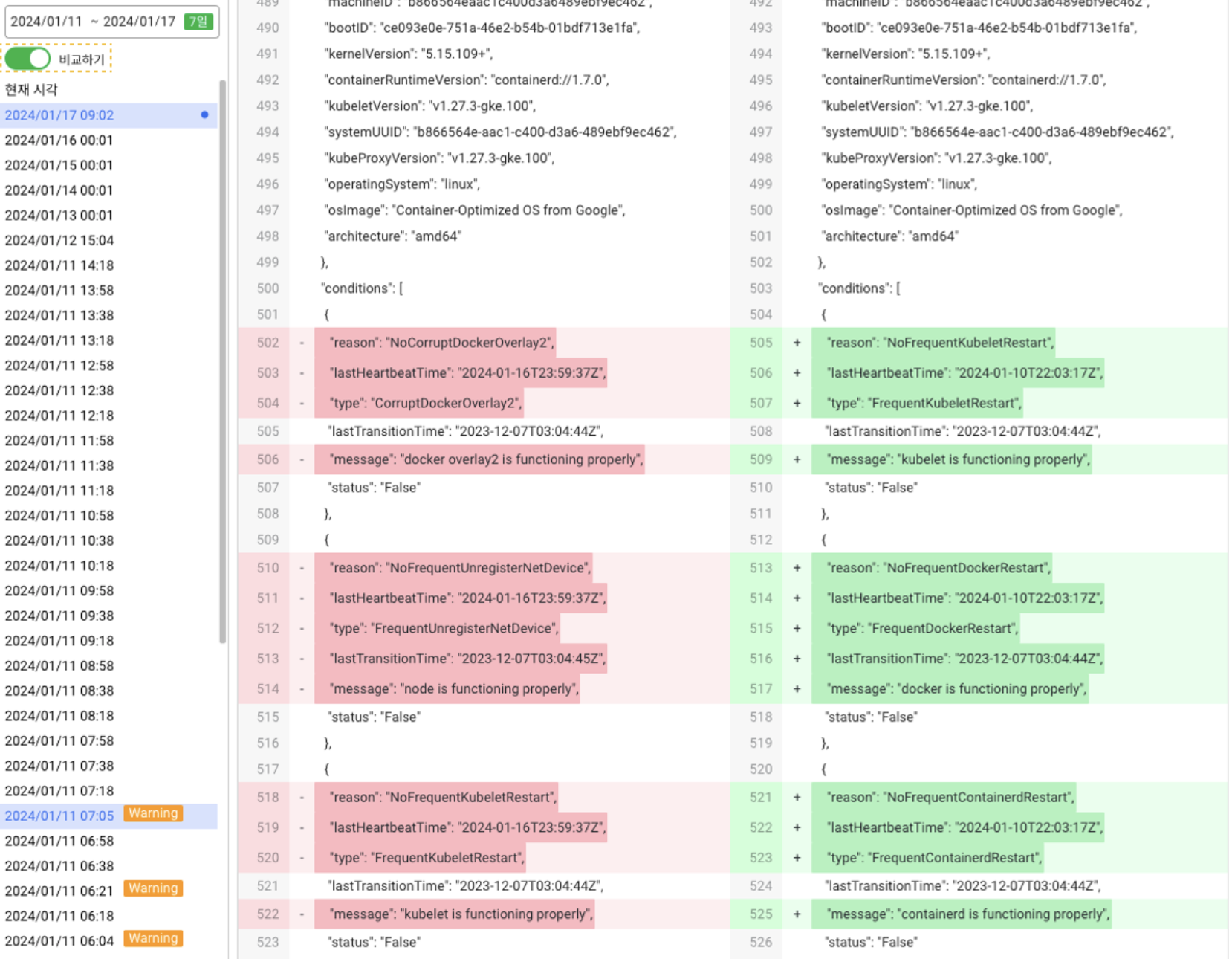 비교하기 버튼을 통해 두 날짜 간 오브젝트 매니페스트를 간편하게 비교할 수 있습니다. 이를 통해 변경된 사항을 빠르게 확인하고 문제를 해결할 수 있습니다.