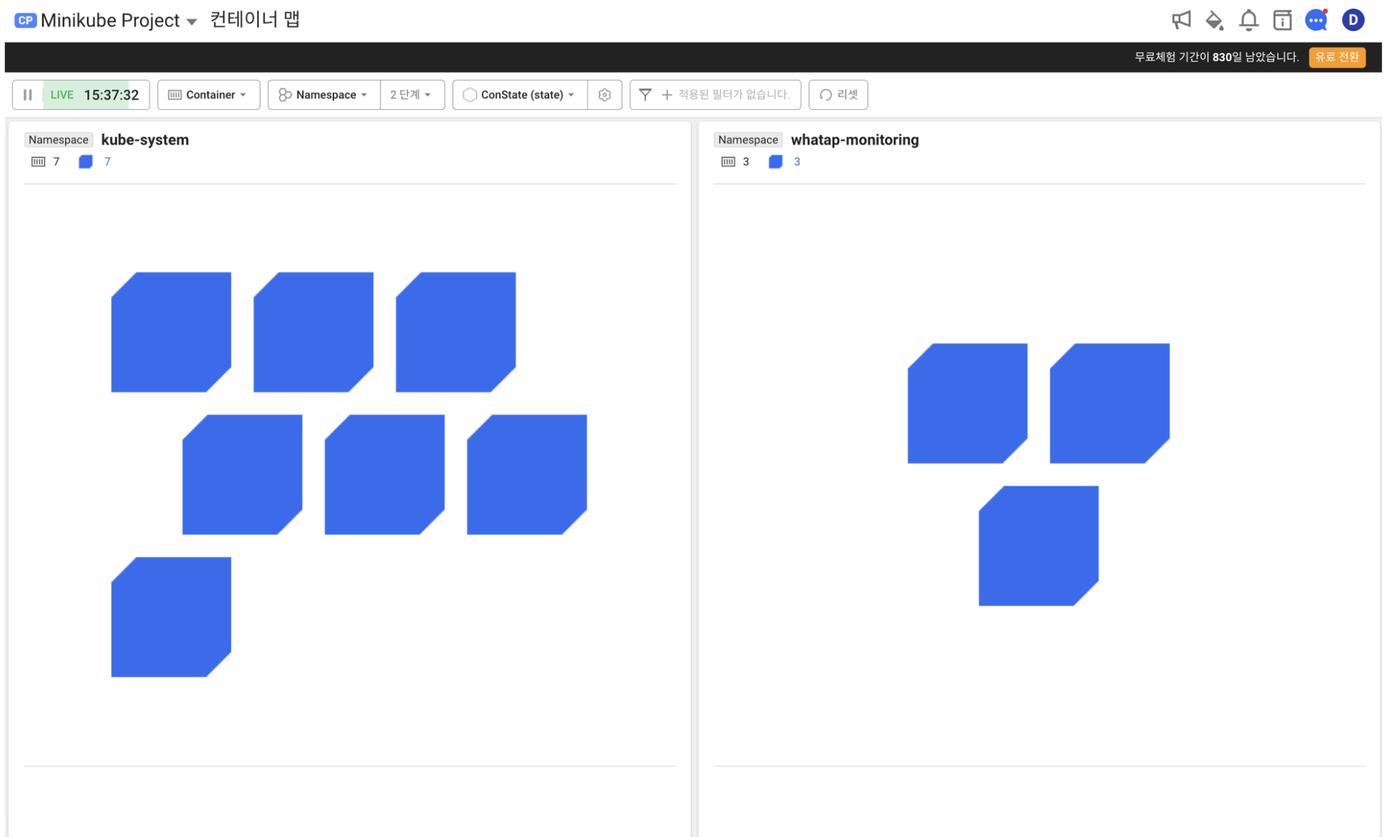- 설치가 완료되면 와탭 웹사이트에서 컨테이너 맵에 아래의 화면과 같이 표시됩니다. 쿠버네티스 에이전트가 성공적으로 설치되었음을 나타냅니다.