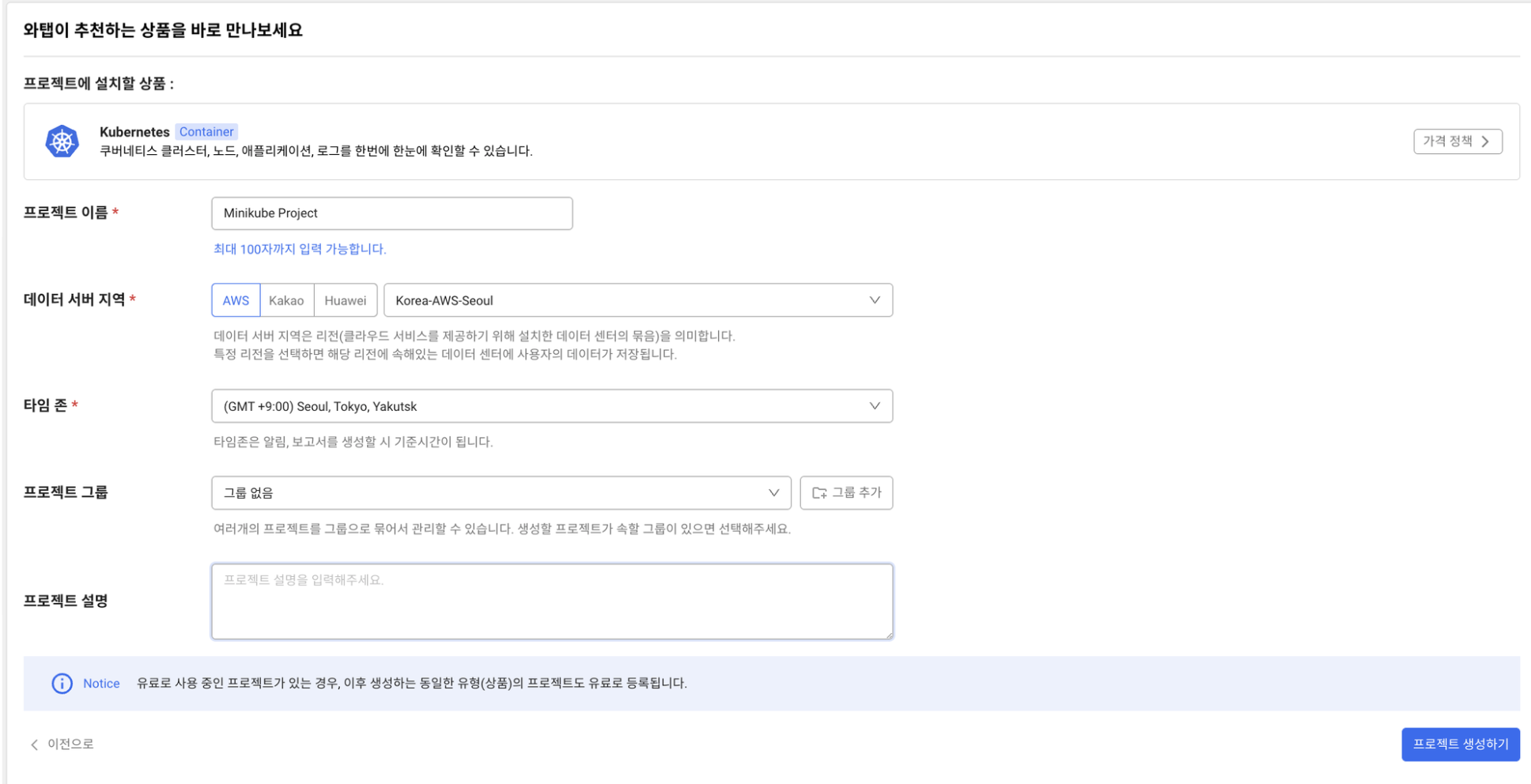 - 와탭계정을 로그인하여 쿠버네티스 프로젝트를 생성합니다.