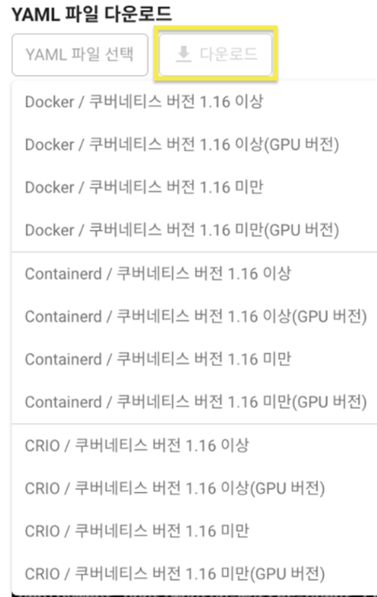 - VERSION과 CONTAINER-RUNTIME에 맞는 YAML을 선택하고 파일을 다운로드합니다.