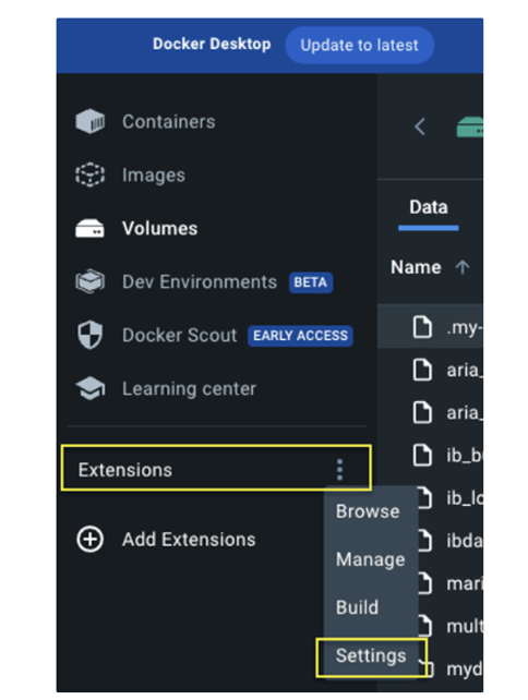 - Docker Desktop을 실행한 후, 상단 좌측 메뉴 바에서 "Extension"에서 "Setting"을 선택합니다.