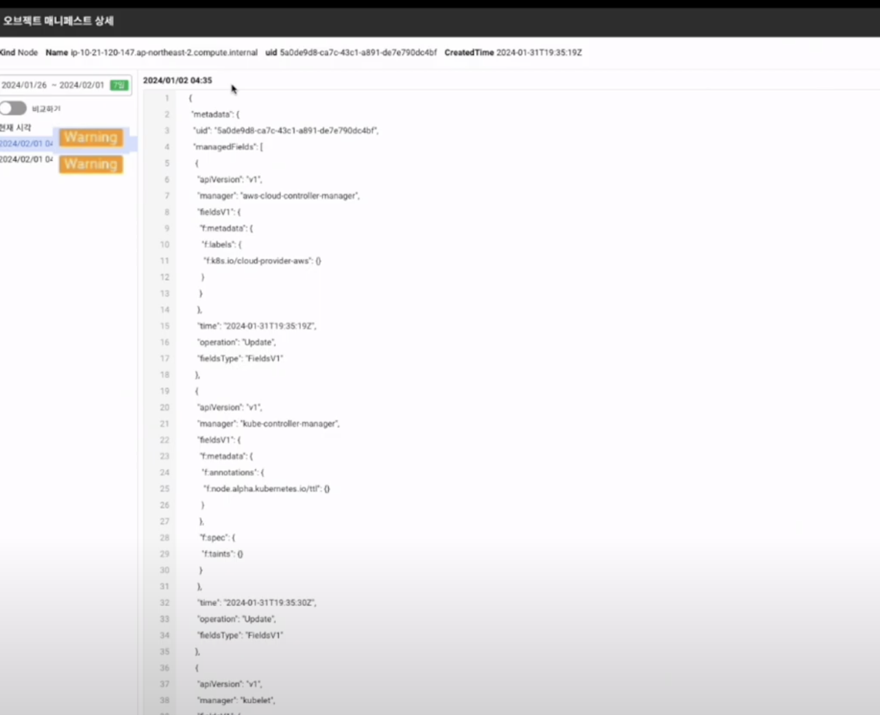 Warning 이벤트가 발생할 때, 해당 데이터는 자동으로 추가 저장되므로, 이벤트가 발생한 리소스를 추적하여 문제를 해결할 수 있습니다. 이를 위해 해당 리소스에 대한 yaml 파일을 확인하고, 변경된 부분을 비교하여 문제를 해결할 수 있습니다.