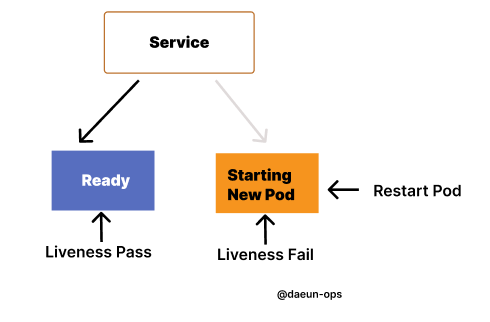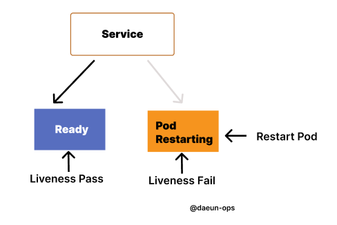 - 쿠버네티스는 LivenessProbe를 통해 Application이 살아있는지 죽었는지 알 수 있다. appication이 살아있으면 kubernetes는 appication을 그대로 둔다. appliction이 종료된 경우 kubernetes는 Pod를 제거하고 이를 교체하기 위해서 새 Pod를 시작한다.