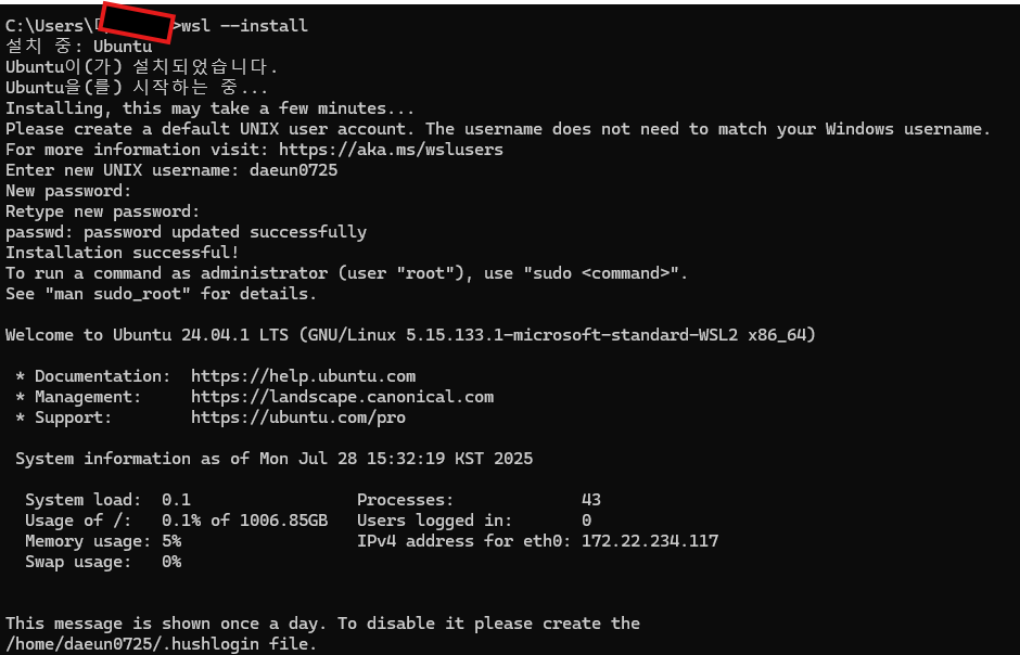 Windows에서 리눅스 개발 환경을 구축하기 위해 WSL(Windows Subsystem for Linux) 을 설치하고, Ubuntu 배포판을 설정했습니다.