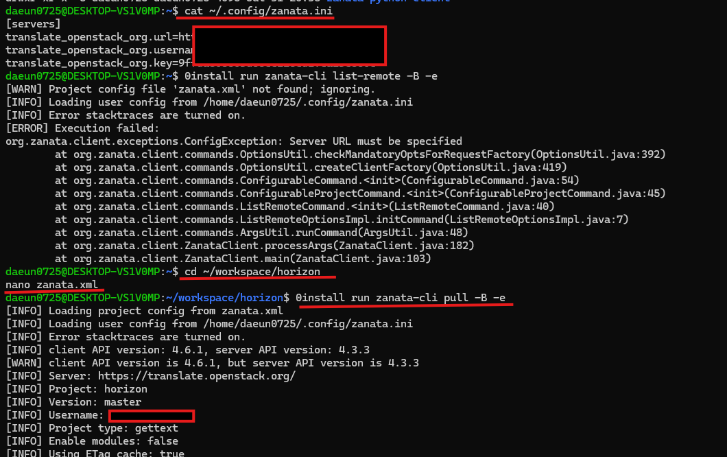 Zanata CLI를 통해 OpenStack Horizon 프로젝트의 번역 파일을 성공적으로 내려받았습니다.
