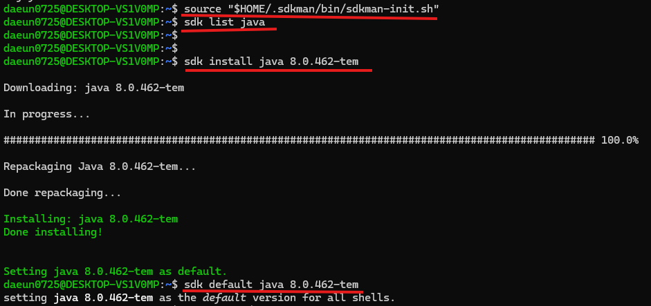 ✅ Java 8이 정상적으로 설치되었고 기본 Java로 설정 완료.
