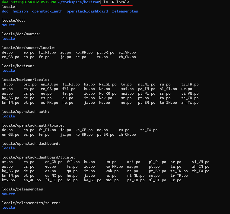 작업 디렉토리인 ~/workspace/horizon 내부의 locale/ 폴더에 다양한 하위 구성요소별로