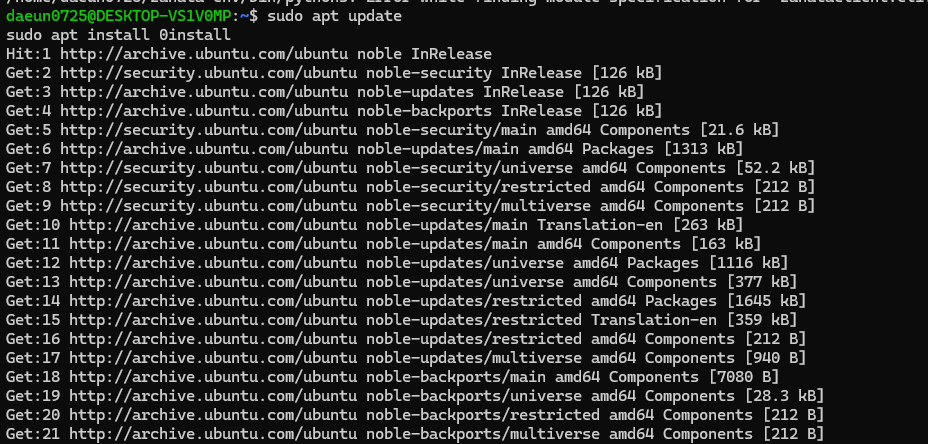 Ubuntu 환경에서 패키지 목록을 최신으로 업데이트하고, 개발에 필요한 도구인 Python3, pip, git을 설치했습니다.
