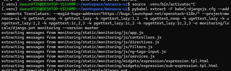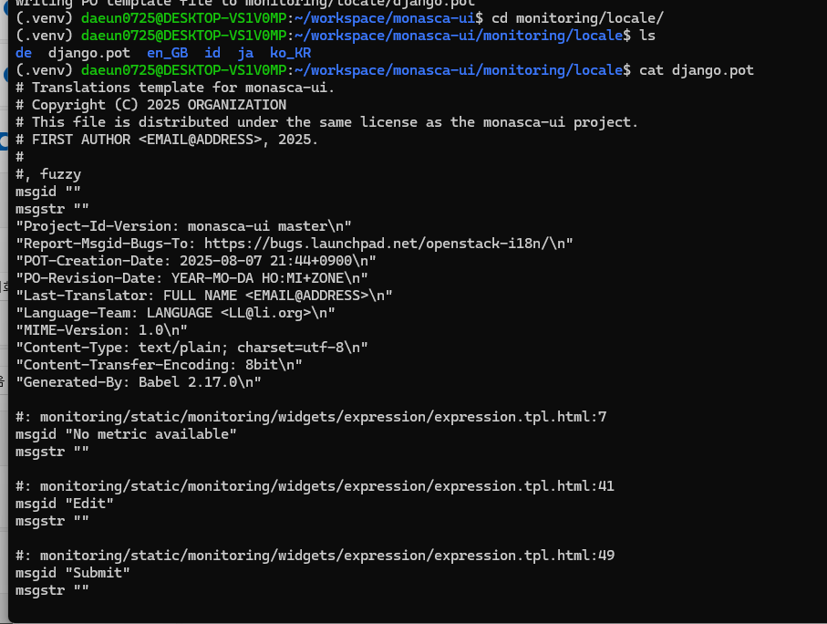 monasca-ui 프로젝트의 번역 기반이 되는 POT (Portable Object Template) 파일을 직접 생성하고 번역 프로세스를 실습해보았습니다.