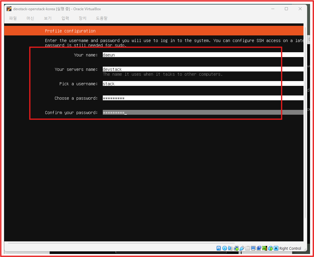 지금은 Profile configuration (사용자 계정 설정) 단계예요.
