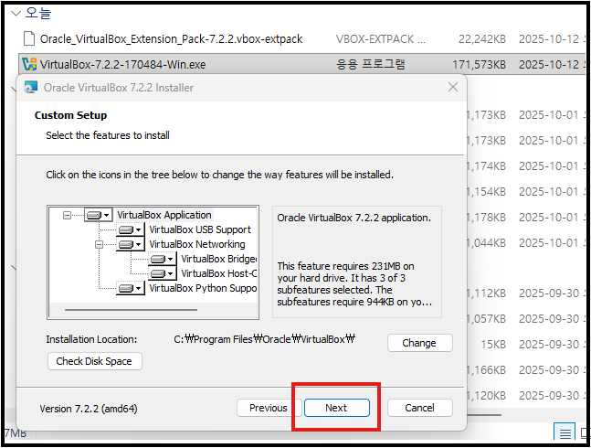 지금 보이는 화면은 Oracle VirtualBox 7.2.2 설치 중 “Custom Setup” 단계 입니다.