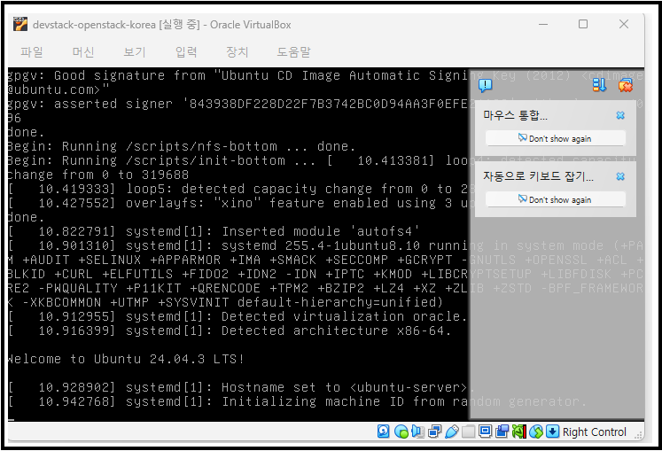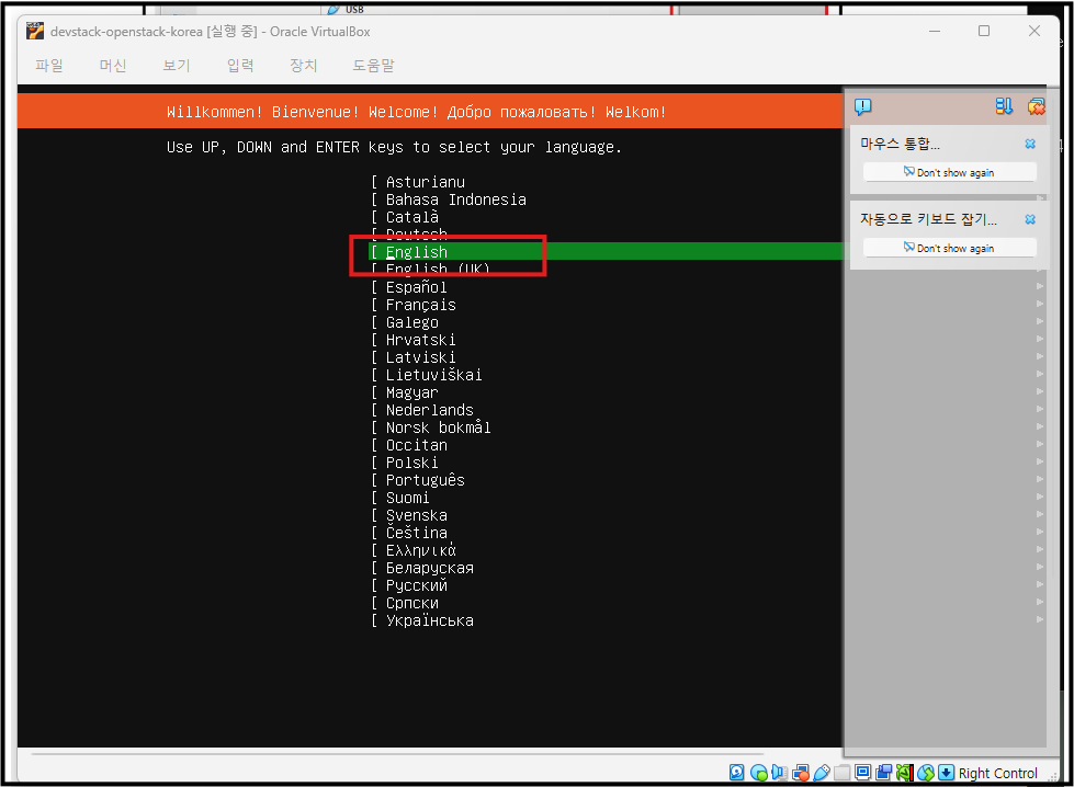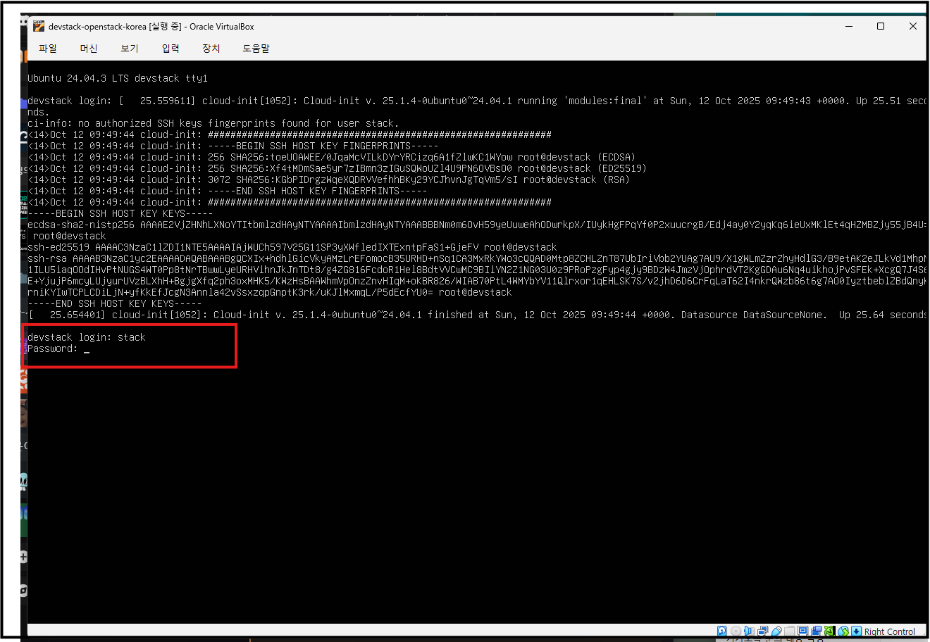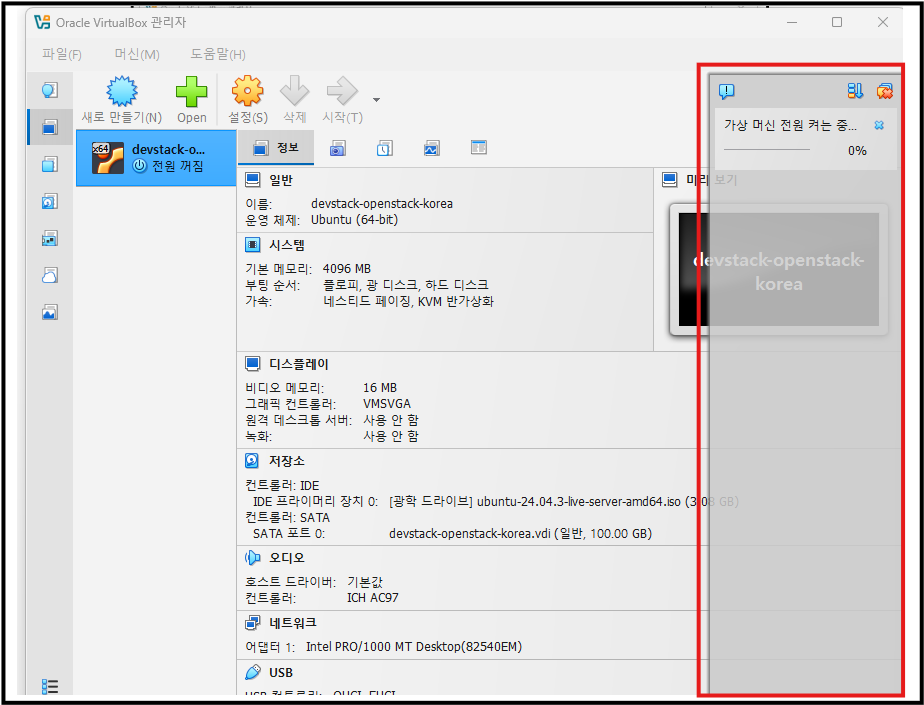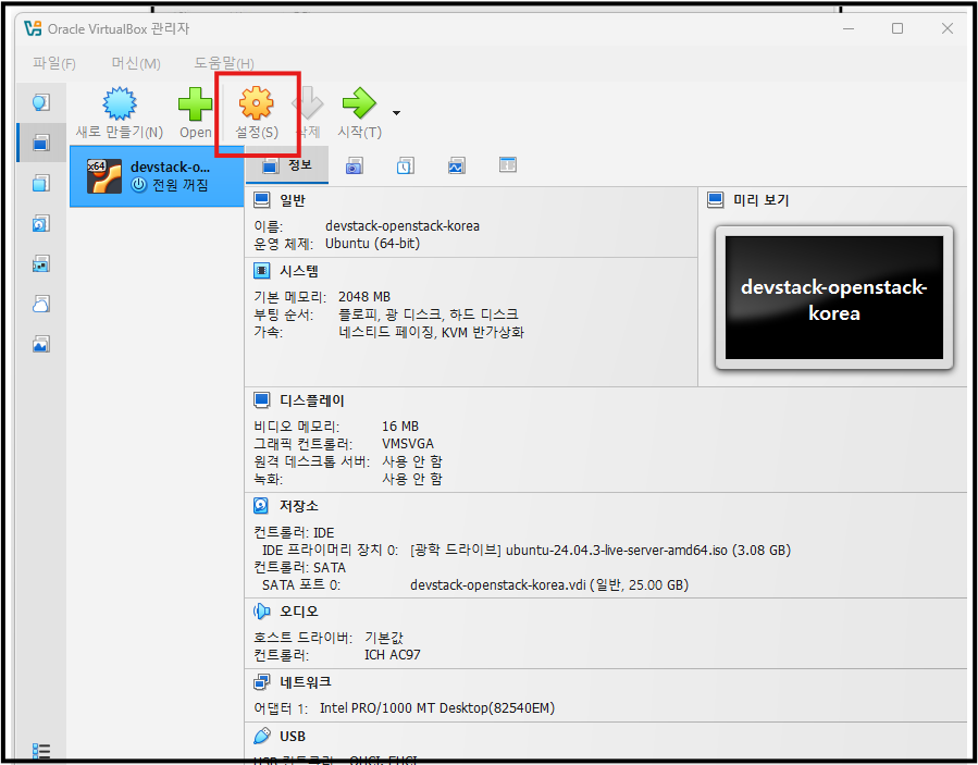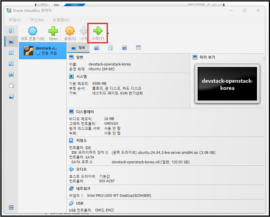 • VirtualBox 왼쪽에서 devstack-openstack-korea 선택