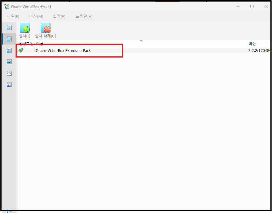Oracle VM VirtualBox Extension Pack 항목이 등록되어 있고 버전이 7.2.2로 표시되고 있죠.