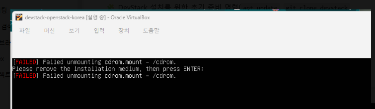 지금 ISO 파일(설치 DVD 역할)이 여전히 연결되어 있어서 unmount가 안 되는 상태예요.