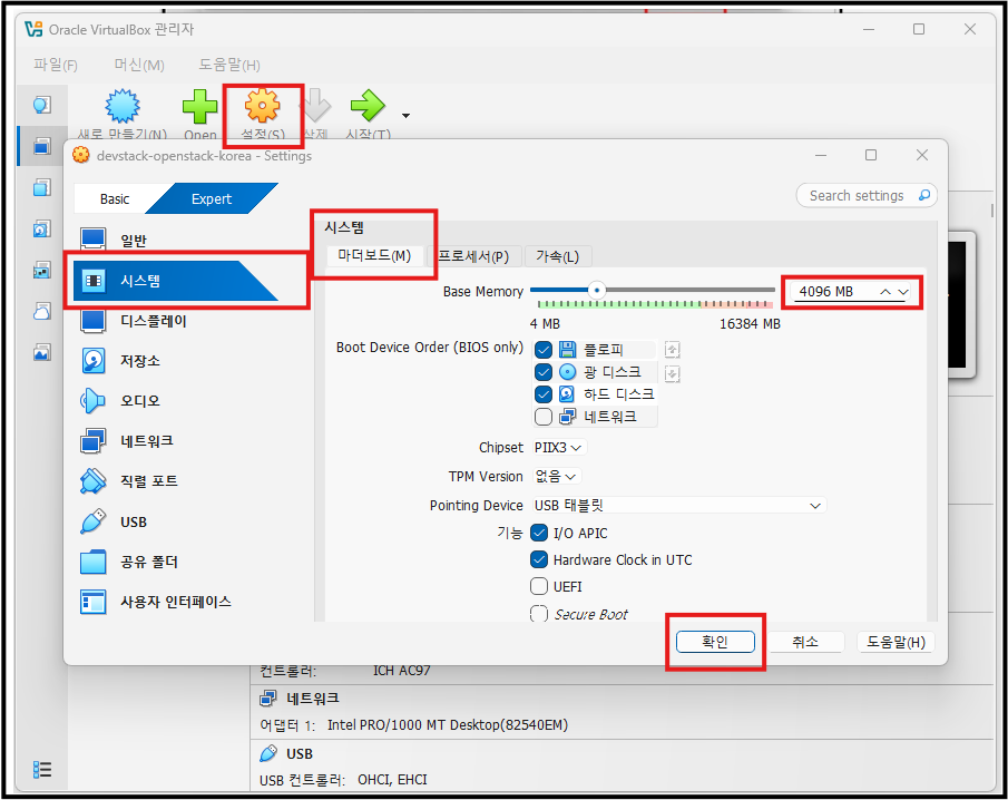 • 👉 4096MB 로 조정 (DevStack은 최소 4GB 권장)