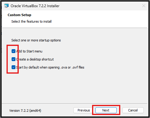 Add to Start menu 시작 메뉴에 VirtualBox 바로가기를 추가합니다. ✅ (기본값 유지 추천)