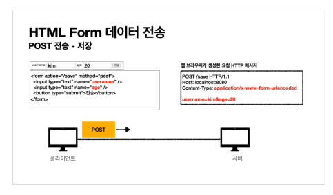 content-type: application/x-www-form-urlencoded 메시지 바디에 쿼리 파리미터 형식으로 전달 username=hello&age=20 예) 회원 가입, 상품 주문, HTML Form 사용