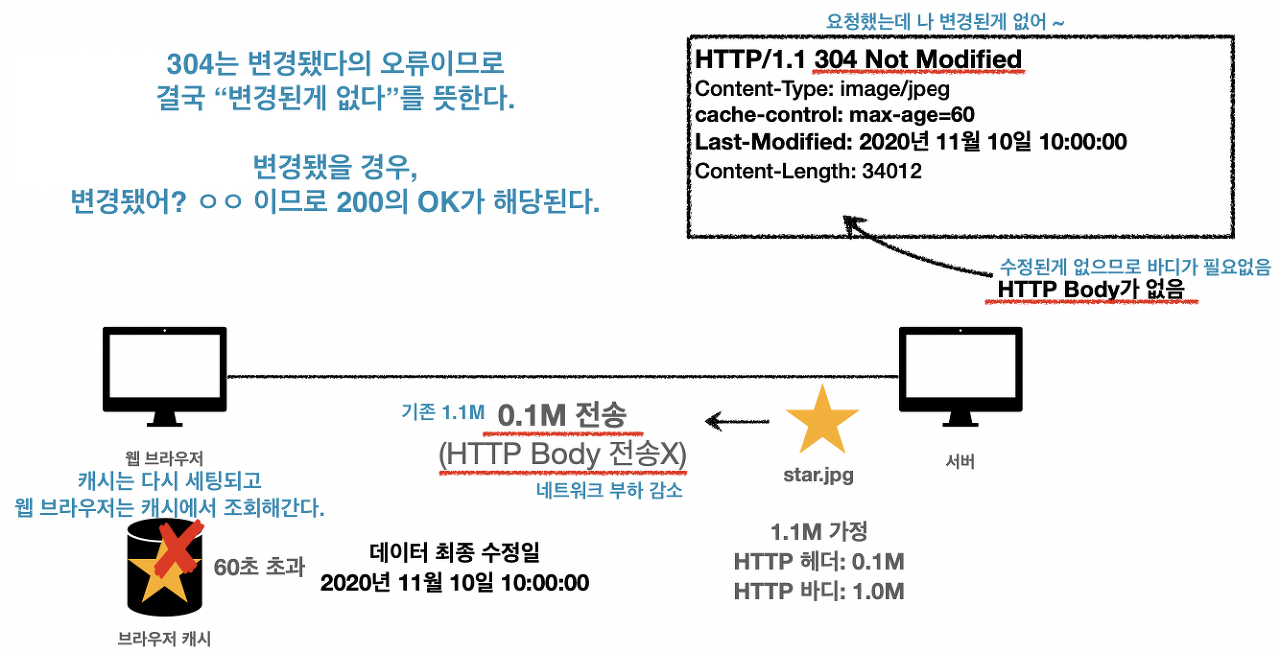 캐시 유효 시간이 초과했다고 하더라도, 서버의 데이터가 갱신되지 않으면 304 Not Modified 응답과 함께 헤더 메타 정보만 날려 0.1M의 작은 데이터만 전송할 수 있다.