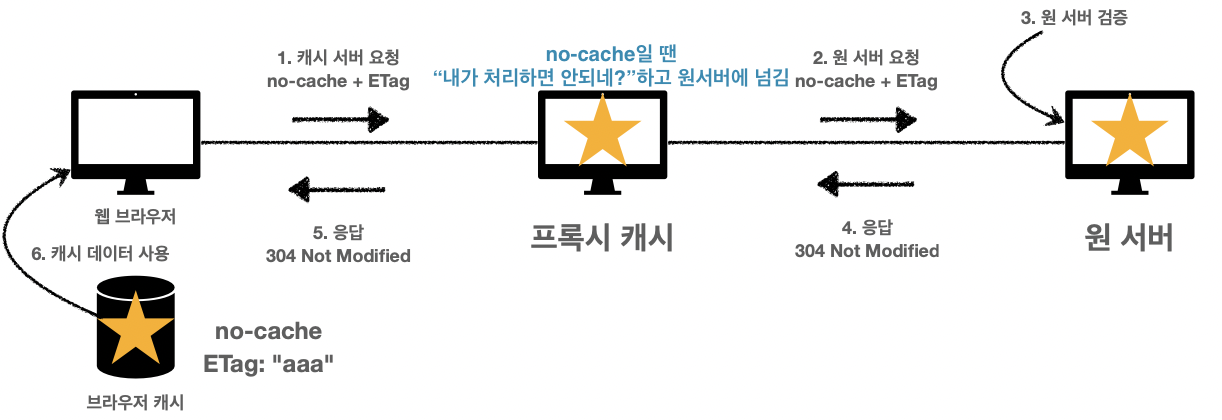 ex. 헤더에 ETag="aaaa"를 같이 보내줌. 캐시에 이를 저장하고 이를 비교.