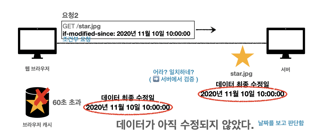 클라이언트는 캐시에 저장된 데이터를 재활용하여 결국 네트워크 다운로드가 발생한다고 해도 용량이 작은 헤더 정보만 다운로드해도 되므로 매우 실용적인 해결책이라고 할 수 있다.