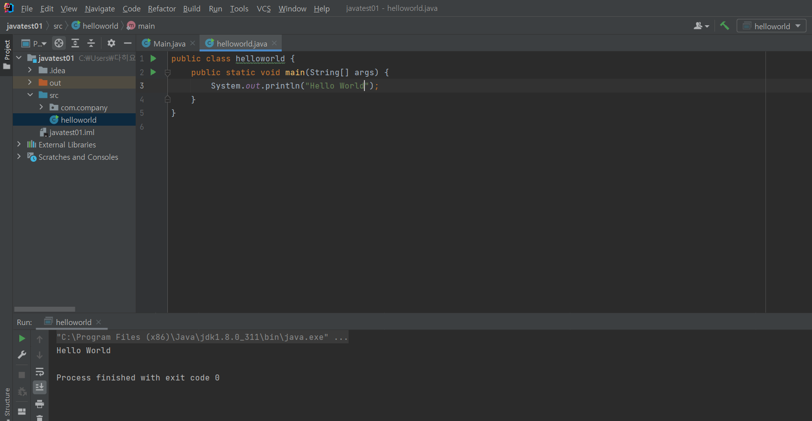public class helloworld { public static void main(String[] args) { System.out.println("Hello World"); } } public class helloworld { //helloworld라는 클래스정의 첫번째-마지막 중괄호 사이에 hello world 클래스 내용이 들어감 public static void main(String[] args) { //접근제어자 public or private, 클래스 안에 정의된 내용, 메소드란 클래스안에 정의된 함수, main= 정의할 메소드(함수)이름, 이 main메소드는 args라는 문자열배열을 파라미터로 받음. //main메소드 앞에 지금 void라고 적혀 있는 것은 메소드의 리턴값을 선언하는 ..