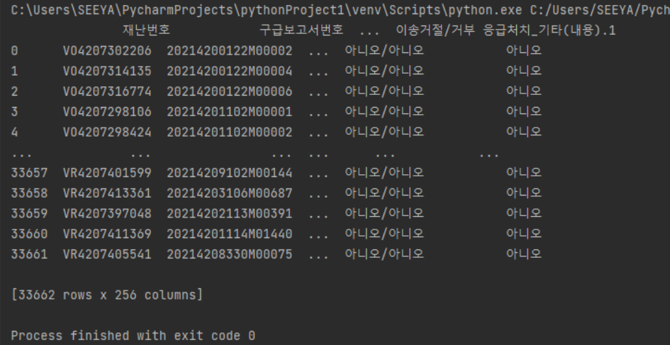 import pandas as pd import warnings import os warnings.simplefilter("ignore") fileDir = "C:/Users/SEEYA/Desktop/Data/구급일지/" # 파일경로+ 폴더명 fileNm = "AAA.csv" # 파일 이름 data = pd.read_csv(fileDir + fileNm, encoding='CP949') selectdata = pd.DataFrame(data, columns = ['재난번호','구급보고서번호']) #조회할 컬럼 지정해서 출력하고 싶을 때 print(selectdata)